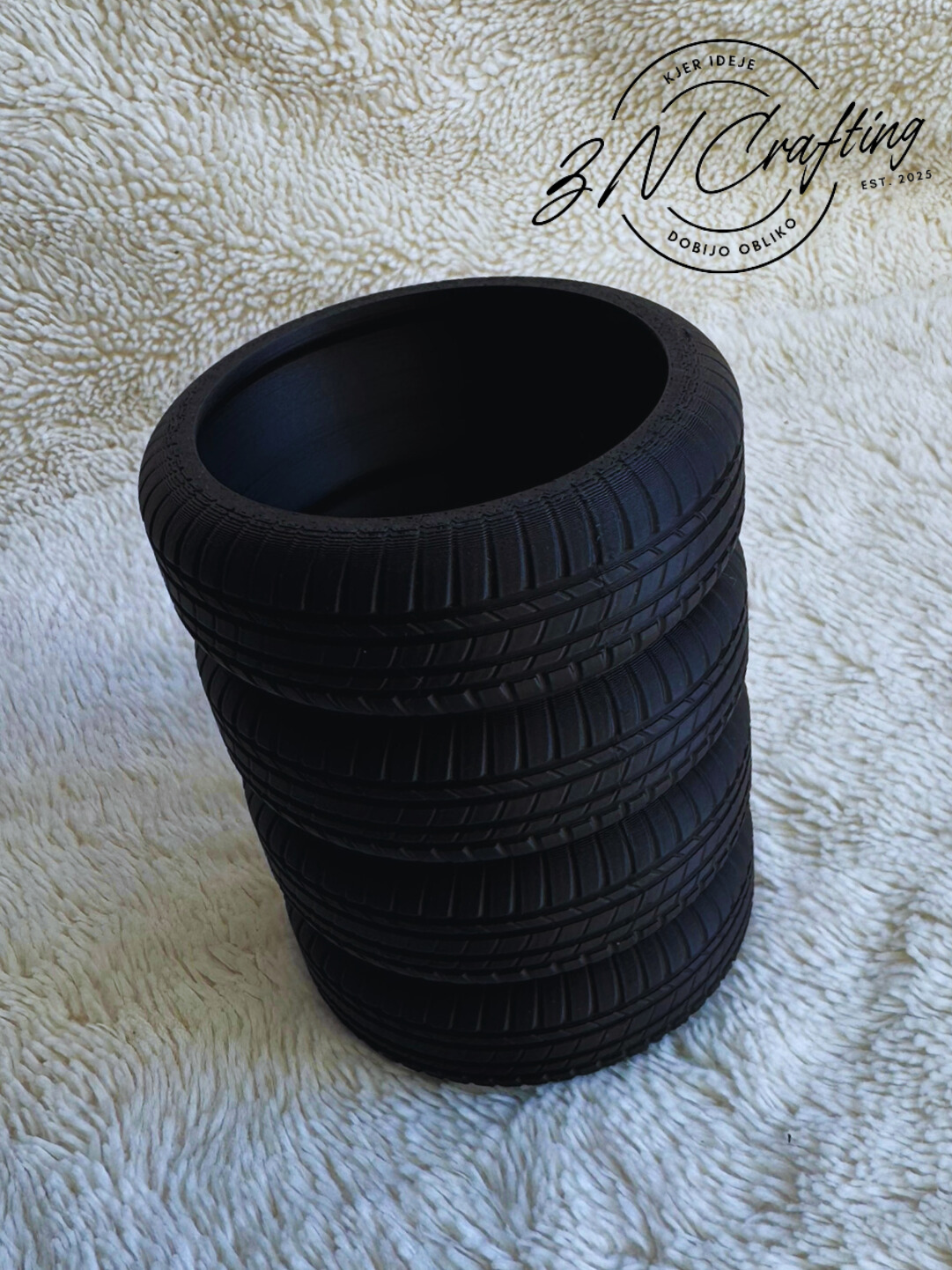 Unikaten organizator v obliki zloženih pnevmatik je idealen za ljubitelje avtomobilizma in industrijskega dizajna. Uporaben kot lonček za pisala, orodje ali druge potrebščine, prinaša pridih adrenalina in organiziranosti v vsak prostor. Popolno darilo za vse avtomobilske navdušence!